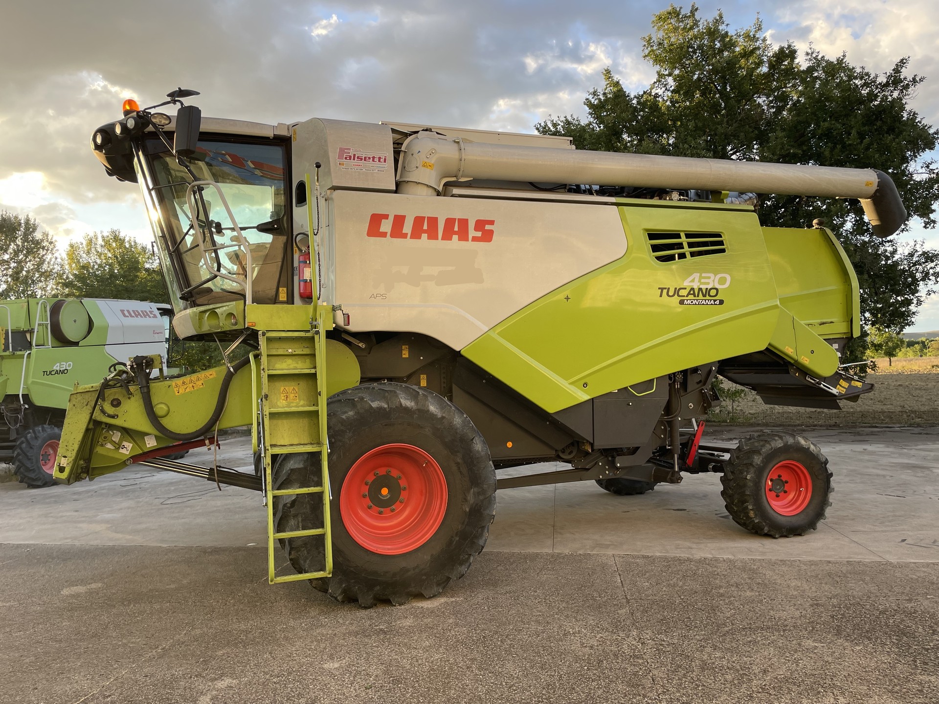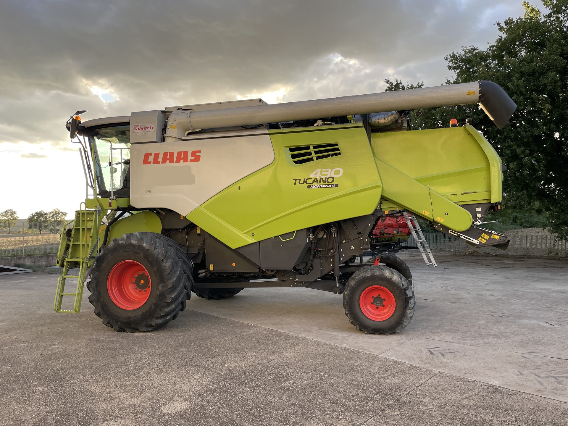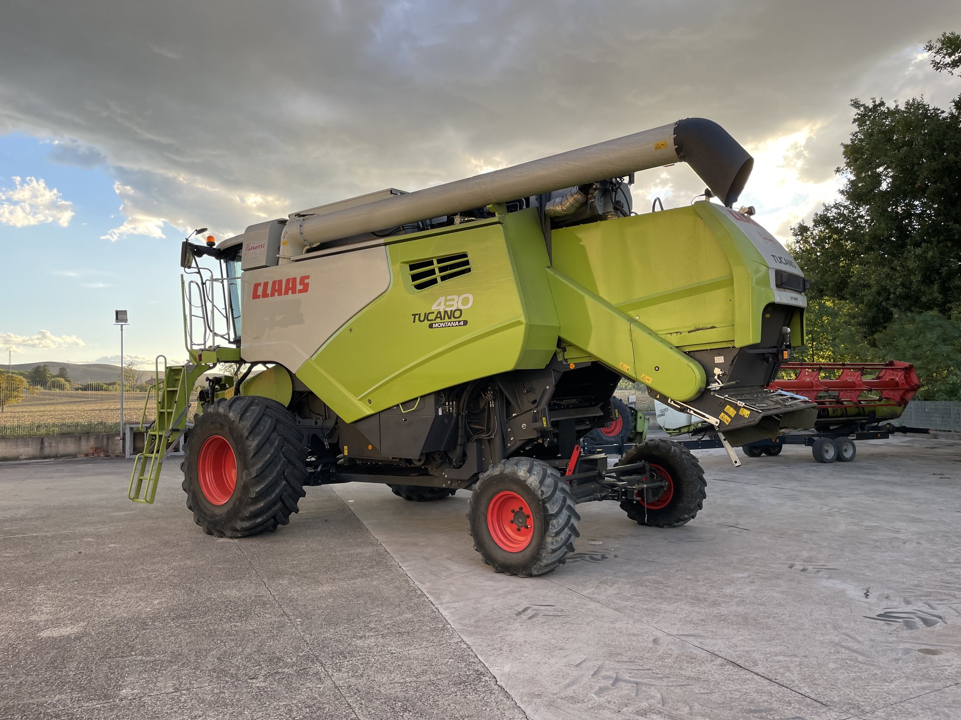 Mietitrebbia Claas Tucano 430 Montana 4, anno 2022, 750 ore di lavoro. Macchina autolivellante completa di crivelli elettrici, doppia trazione, autocontour, quantimetro, impianto ingrassaggio automatico, sistema di crivellazione a turbine, radio con bluetooth, telecamera posteriore, allestimento massimo dei fari di lavoro, pneumatici 800/65 R32. Barra grano Claas Cerio 620.