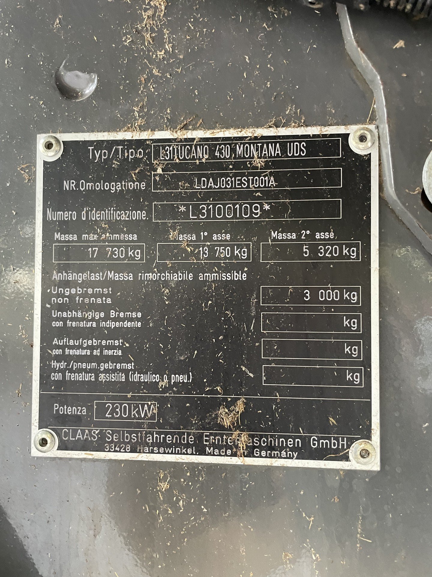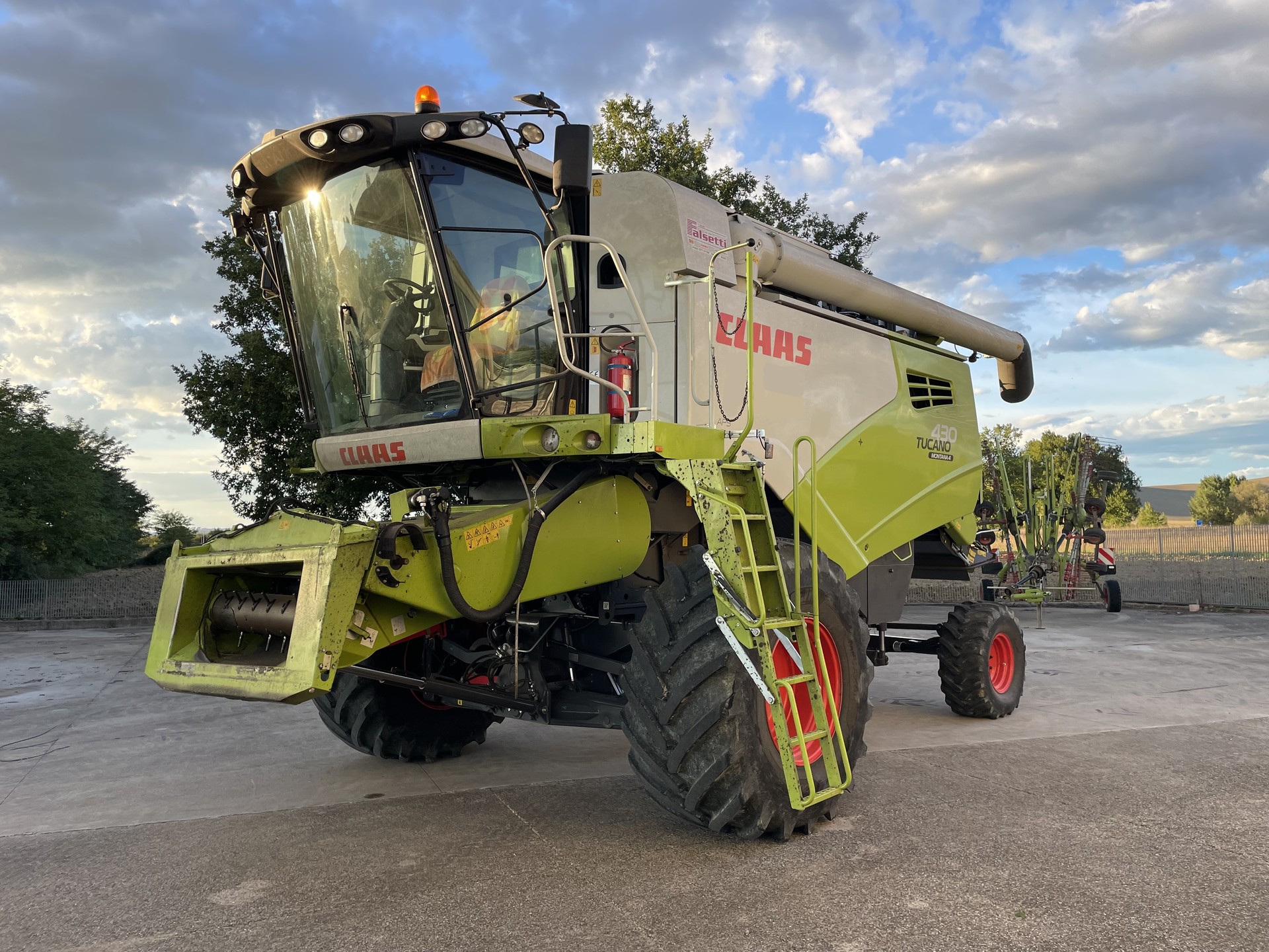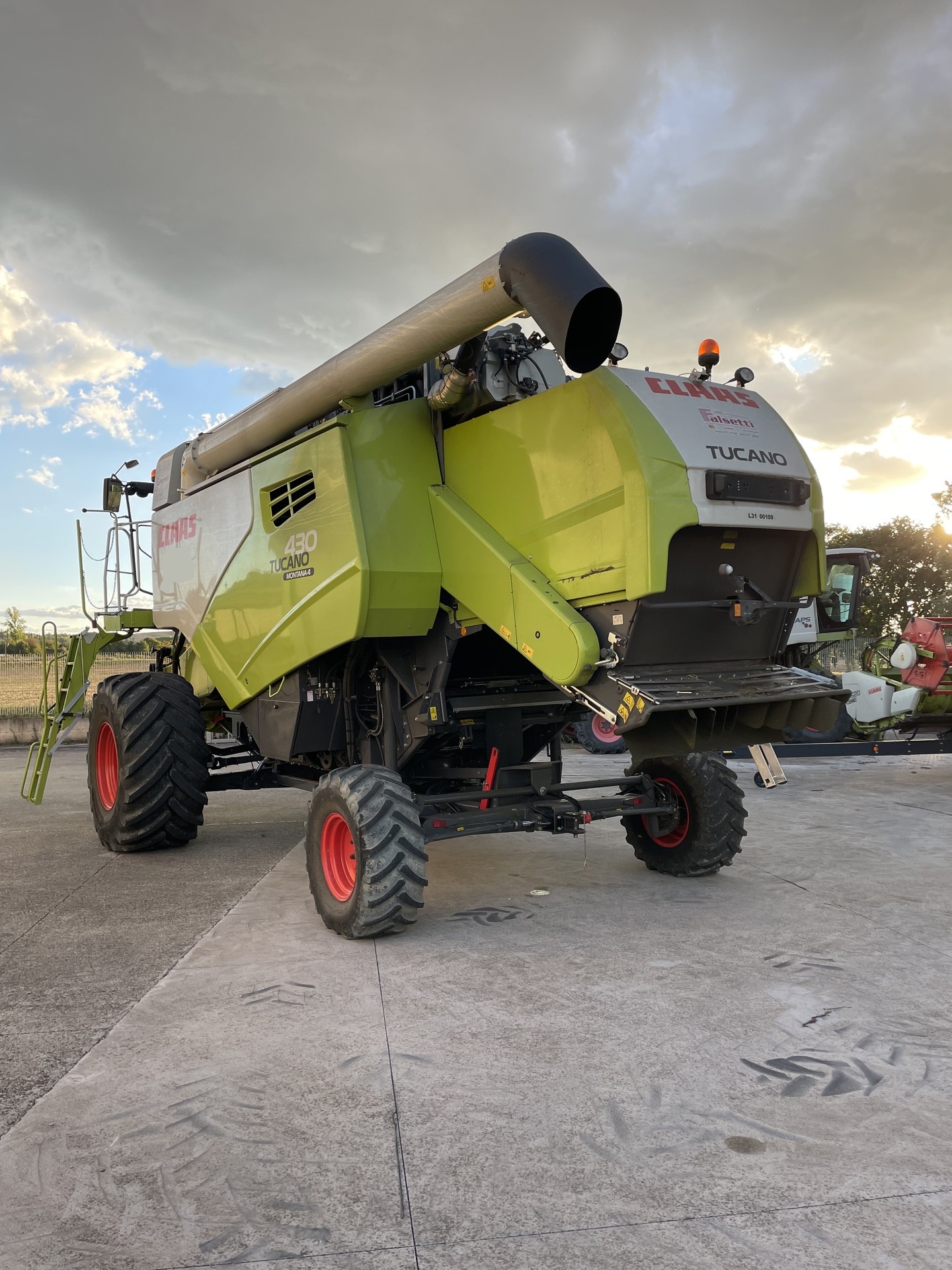 Mietitrebbia Claas Tucano 430 Montana 4, anno 2022, 750 ore di lavoro. Macchina autolivellante completa di crivelli elettrici, doppia trazione, autocontour, quantimetro, impianto ingrassaggio automatico, sistema di crivellazione a turbine, radio con bluetooth, telecamera posteriore, allestimento massimo dei fari di lavoro, pneumatici 800/65 R32. Barra grano Claas Cerio 620.