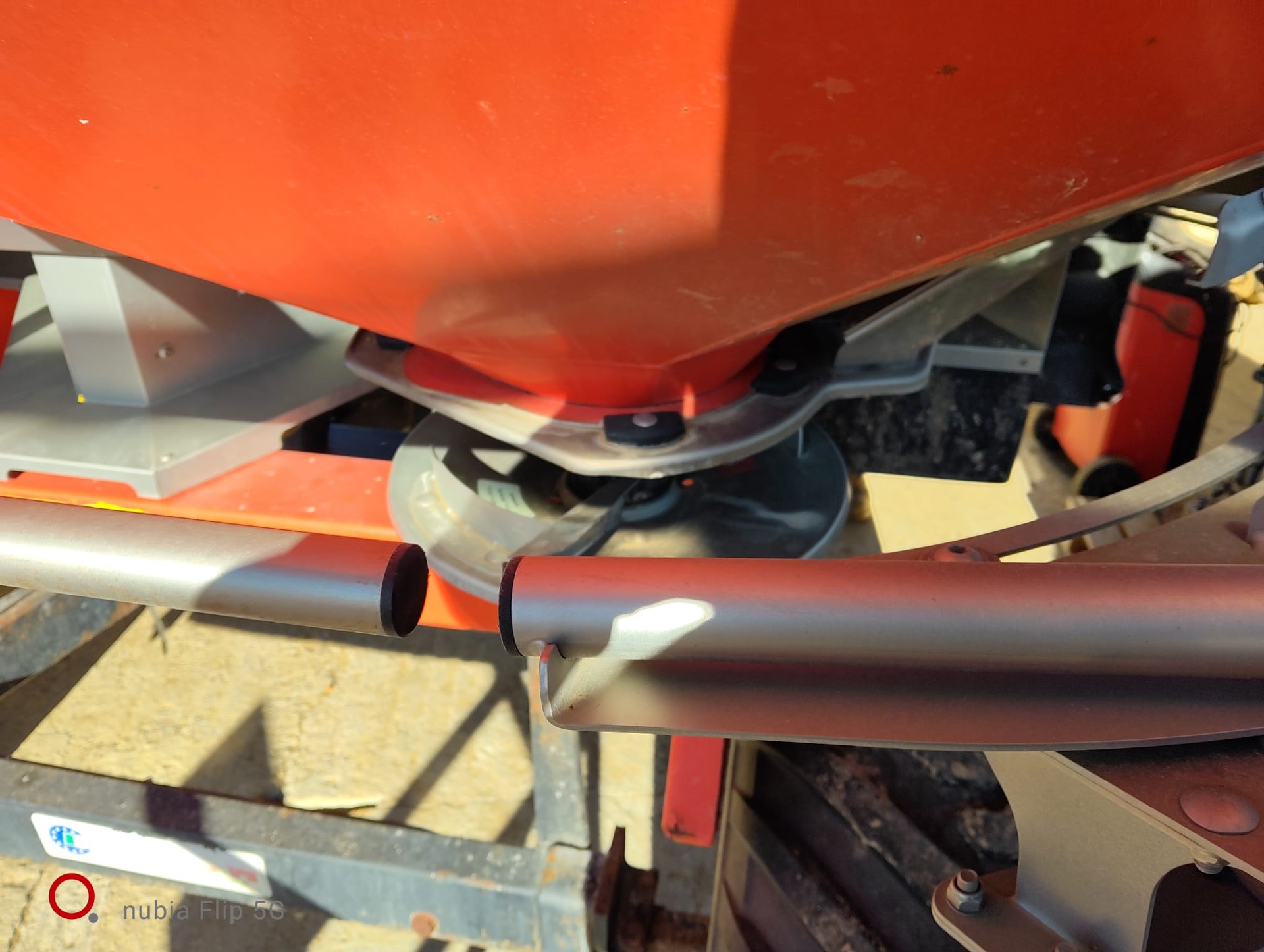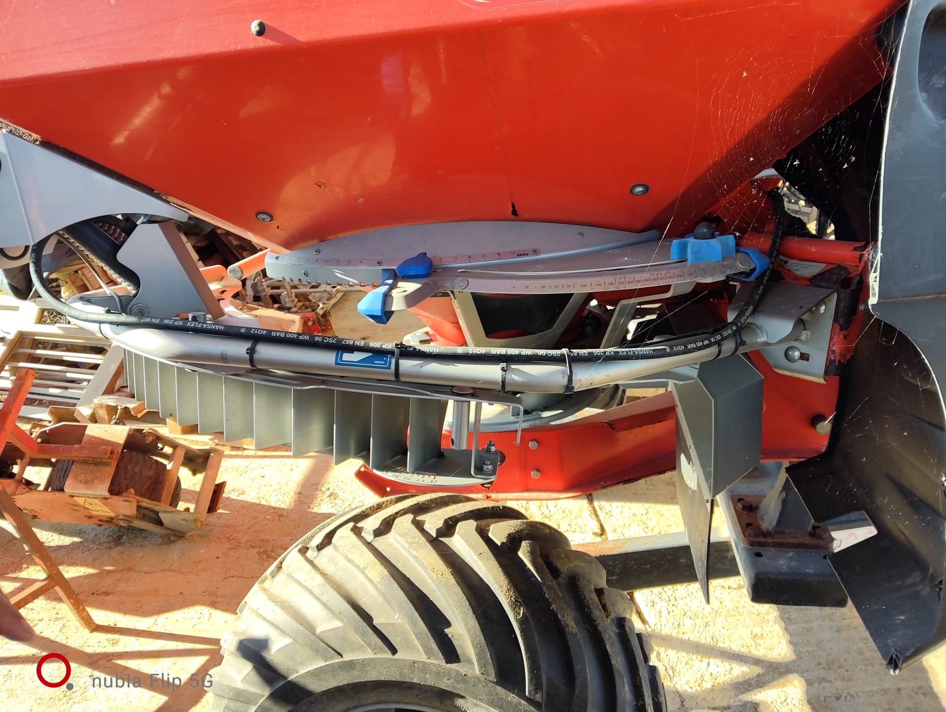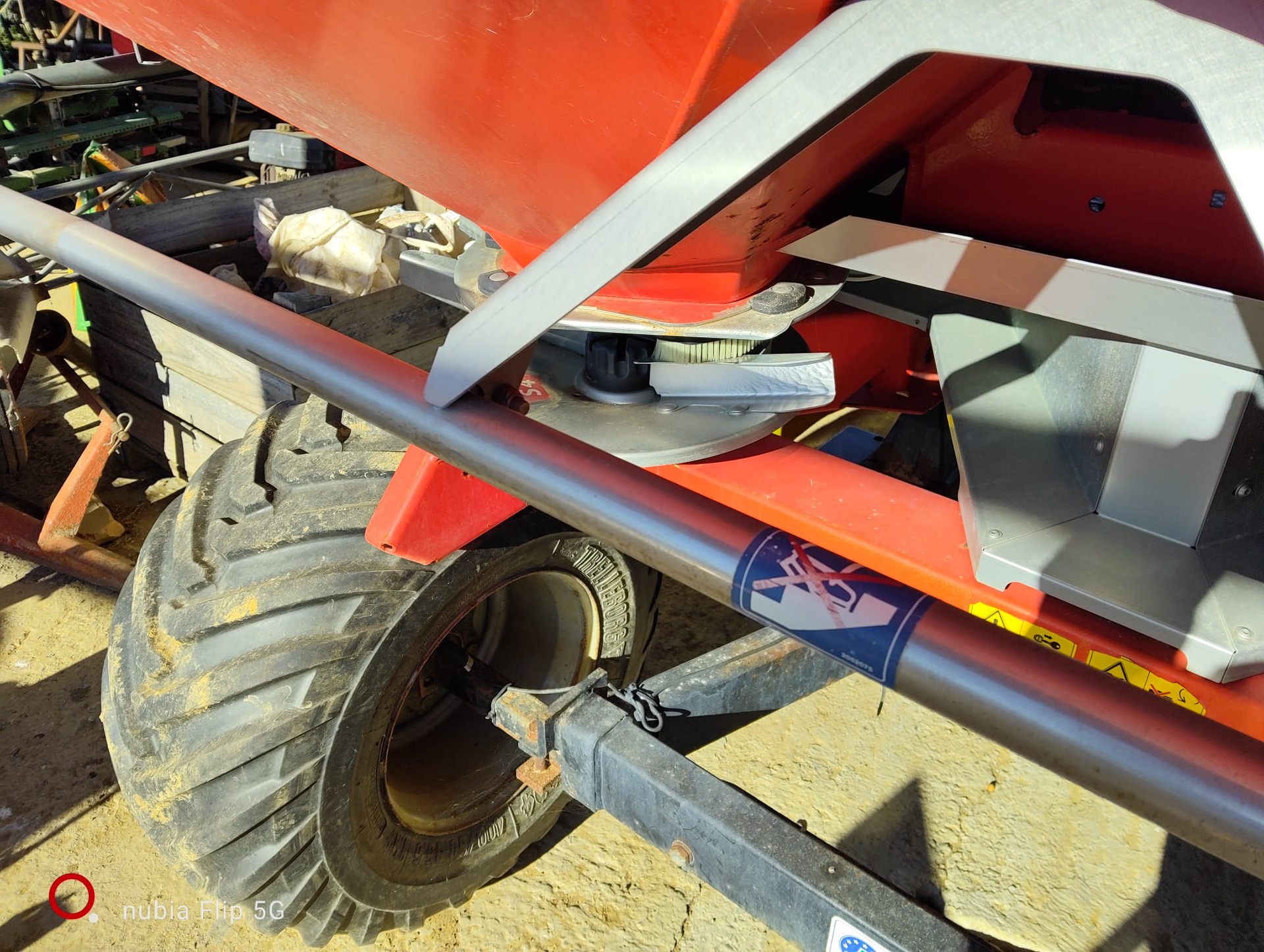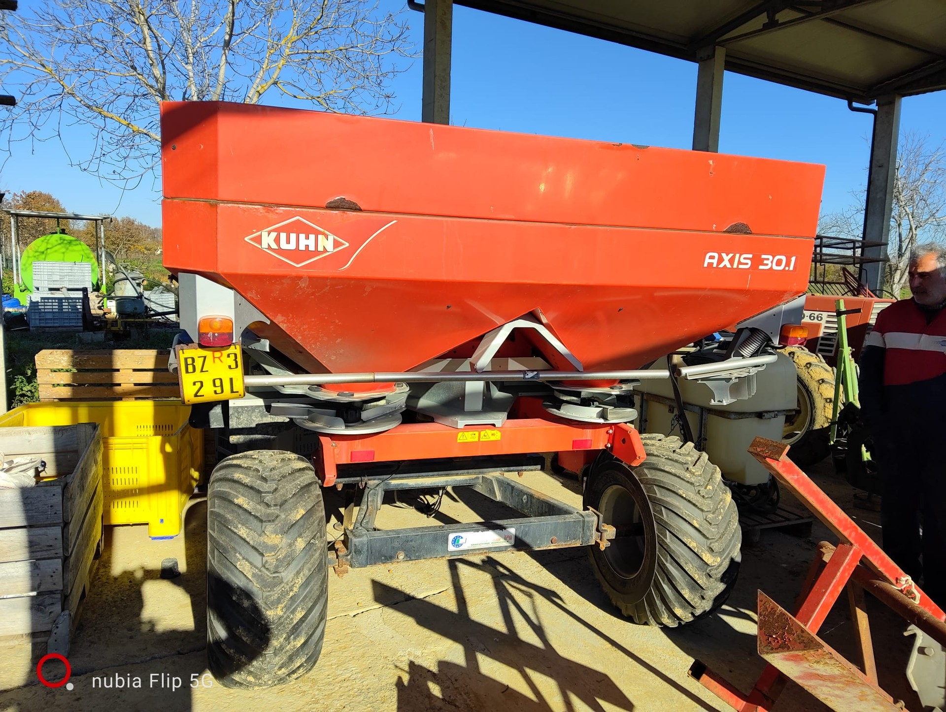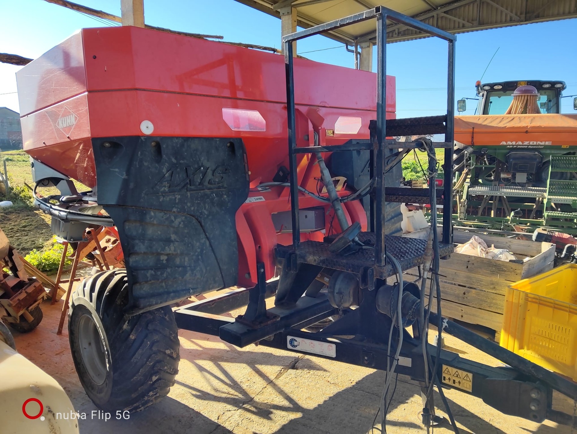 Spandiconcime Kuhn 30.1, modello a doppio attacco (portato + trainato). Macchina proporzionale, completa di computer con sistema di spargimento proporzionale all’avanzamento; capacità con sovrasponda di 2000 lt, doppio disco inox con limitatore di spargimento destro idarulico e carrello Faza con pedana d’ ispezione.